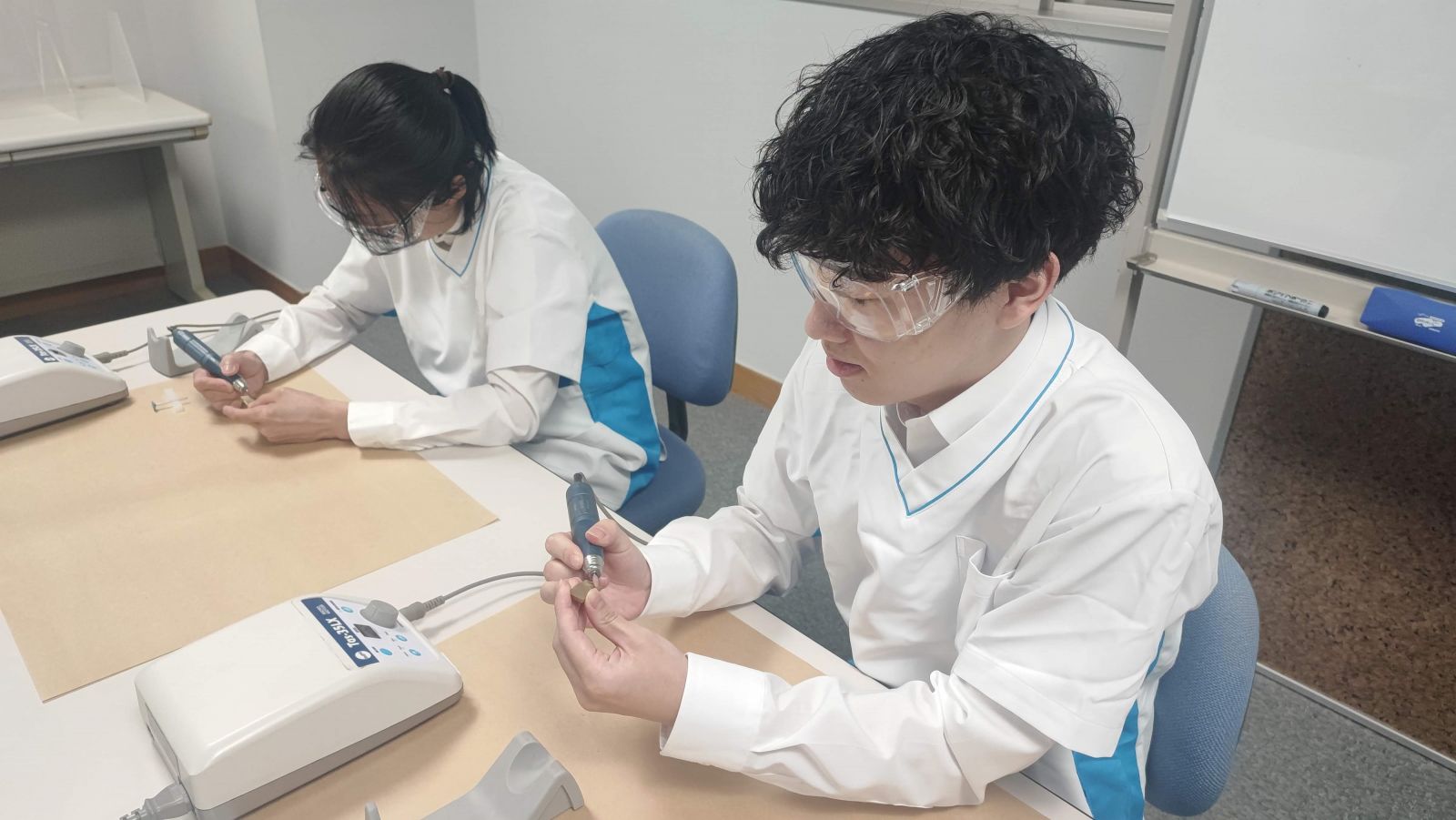新しい「Ayumi Terrace」で最新の製品を見学し、理工実習として、歯の測色・レジン築盛・表面粗さ測定も行っていただきました。